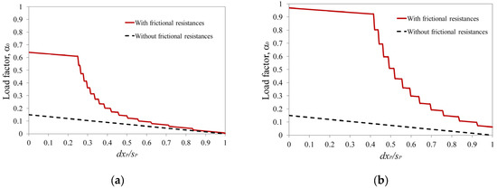 Figure 6. Influence of the frictional resistance due to interlocking between orthogonal walls after the hinge formation [13,49]. Pushover curves with unit aspect ratio hb/lb = 1/3 (a) and hb/lb = 1/5 (b).