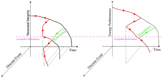 The CO2/year emission, joined with the energy spent every year to reach serviceability comfort conditions, represent a primary indicator of the efficiency of the buildings. The most relevant part of energy consumption is commonly represented by the façades. The correct maintenance of their thermal and mechanical properties is crucial: indeed, each construction is subjected to the continuous degradation of structural and energy performance due to environmental actions, anthropic actions, and endogenous ageing (continuous degradation). In addition, they can be affected by episodic events like fire [1], explosions [2,3,4], and seismic actions [5,6,7] or other phenomena like deliberate attacks or human errors (discontinuous degradation). These events can sharply reduce the structural or energy performances of building and their service life. Figure 2 presents a qualitative decrease of performances in the presence of continuous time aging (progressive reduction of performances depending from time) and of traumatic events (discontinuous reduction of performances in case of discrete events). The structural integrity and the energy performance of a building can be described as a monotonic decreasing functions of time with the red lines in Figure 2. After a disruptive event (like fire or impact, earthquake, etc.) there is a sharp transition that modifies these functions and often requires a retrofitting in order to reach the minimum serviceability performance level. In case of an absence of traumatic events, the decay of performances is continuous over time (black lines in Figure 2). After retrofitting, an increase of performance can be achieved (green lines in Figure 2), improving the building condition and lengthening its service life. In this sense it can establish an acceptable level of performances (purple lines in Figure 2) commonly fixed by technical documents, guidelines, or codes.