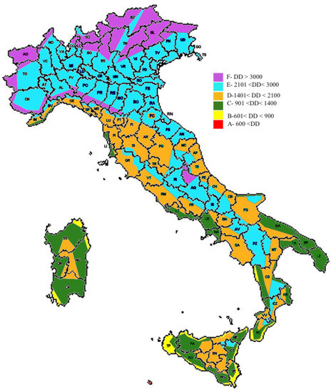 Italian map of heating DD (Degree Day), based on Italian technical code [63].