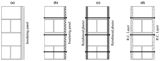 Proposed refurbishment techniques for masonry walls. (a) Single insulating panel by natural first choice cork and traditional plaster on both faces; (b) single polystyrene panel, transverse connectors and traditional plaster on both faces; (c) coupled GFRP (Glass Fiber Reinforced Polymer) plaster and transverse connectors; (d) coupled reinforced concrete layer and transverse connectors.
