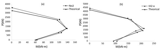 In order to compare the proposed theoretical interaction curves with the experimental results, the interaction curves of specimens No2 and IA2-a from the Rocca [7] study have been considered. Figure 7 shows the theoretical as well as the experimental interaction curves. No environmental and strength reduction factors were considered in developing these interaction diagrams. As seen, the theoretical interaction curves developed with the proposed procedure of this paper are in good agreement with those derived from experimental results in Reference [7].