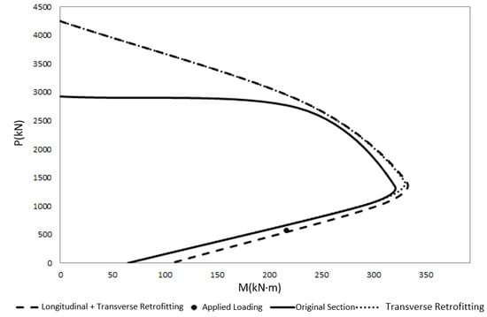 Specifications of the FRP jacket sheets are included in Table 5. These specifications belong to sheets made of carbon and have been extracted from available commercial catalogues. The column has been strengthened based on the simplified procedure of the present research. Therefore, aimed at enhancing loading capacity of the column, retrofitting by using one-layer FRP sheets was taken into account. Interaction curves can be plotted using the design equations presented in previous sections (Figure 9). Solid, dashed and dotted-line diagrams, respectively, correspond to interaction curves of the column without retrofitting, retrofitting with transverse fibers and retrofitting with combined longitudinal and transverse fibers.