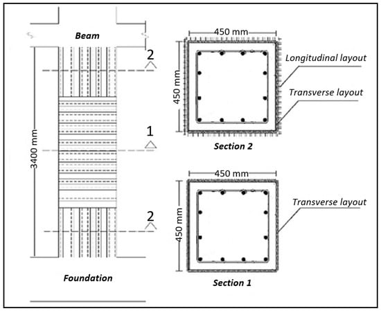 Plan and cross section of the column strengthened with longitudinal and transverse FRP materials.
