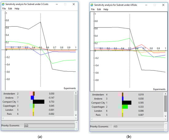 In the case study, the ranking of first two cities are the same for both methods of synthesizing although this is not necessarily true in general. In the short-term, Copenhagen is second, Andorra is the third, and Amsterdam comes in fourth. To further explore our outcome, we can show the sensitivity analysis in the short-term scenario respect to costs and risks. If risks become more important (after 0.50), the compact city, Copenhagen, and Andorra maintain still, respectively, the first, second, and third place (see