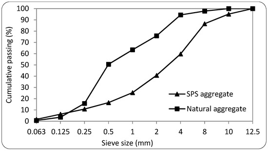 The Type I Portland cement was used to produce different concrete mixtures. The FA used was obtained from a local power station in the UK, and was an unprocessed FA with a high loss-on-ignition (LOI) of approximately 23%. LOI increases with the increase in unburned carbon content in FA. Unburned carbon particles have more surface area and porosity; hence, an increase in water demand of the mixtures is expected. In the present study low-cost materials were used to produce a low-cost concrete and to become an environmentally-sustainable material. To minimise the cost, an unprocessed FA is used. The chemical characteristics of Portland cement and FA are given in Table 1. The particle size distributions (sieving) of FA are shown in Figure 1. A mixed low-cost natural aggregate of 8 mm in size complying with British standard requirements was used for this investigation. The particle size distributions (sieving) details of natural and densified EPS called stabilised polystyrene (SPS) aggregates, complying with BS EN 933-1 [13], are illustrated in Figure 2. The main characteristics including density, specific gravity, and water absorption of natural and SPS aggregates are presented in Table 2. In the case of novel LWA (SPS), due to the coating materials of 10% clay and 20% cement used in the production process (Figure 3) in the present investigation; water absorption of SPS is higher than natural aggregate as expected with almost all LWAs due to their high porosity.