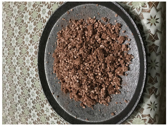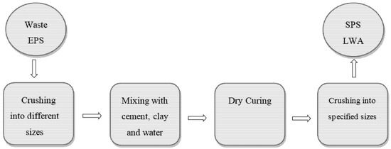In order to achieve a uniform dispersion of the EPS particles in concrete, a new recycling technique has been used [12]. The waste EPS crushed into different sizes (gravel- and sand-sized EPS beads of 2–6 mm mean diameter, angular in shape with an average density of 30 kg/m3) then mixed with the paste made from red clay, cement, and water, then formed into a palm-sized “cake”, which was then dried in the controlled laboratory environment of 20 ± 2 °C and between 60% to 70% relative humidity (RH) for 14 days. The dried rough palm-sized “cakes” then re-crushed at different sizes (0–10 mm) into a novel LWA called SPS. It is worth mentioning here that clay is an abundant resource in most countries and it can be used as an alternative natural binder material to improve the resistance to segregation of EPS in concrete. The great cohesiveness of this binder at the time of wet mixing avoided the segregation of EPS particles. After conducting many trial mixes with different volume ratios, a proportion of 7:2:1:1.5 (70% waste EPS:20% Portland cement:10% clay powder:water) used in the production of SPS has given the best results in terms of maximising the amount of waste EPS for a suitable coating thickness, enhancing bond strength between EPS particles, and the coating material and workability without using too much cement. However, no experiment was conducted on the effect of bond between coating and EPS particles on concrete properties in the present study. The water to cement + clay ratio used (W/(C + C)) was 0.75. Although the finished material of SPS aggregate is very light and easy to move by hand, when incorporated into a concrete, it creates a durable lightweight concrete. It is a chalk-like, soft, friable substance, usually red in colour, 0–10 mm in size (Figure 3). It is porous and low in density. The bulk density of SPS aggregate (457 kg/m3 in solid state) is almost 1/4 of the natural aggregate. Figure 4 illustrates general description of the production process of this novel LWA.