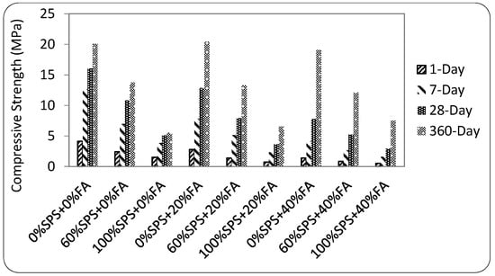 The compressive strength of concretes containing varying amounts of SPS and FA at different curing times is illustrated in Figure 6. The compressive strength was in the range of 3–16 MPa at 28 day curing time and 6–20 MPa at 360 day curing age.