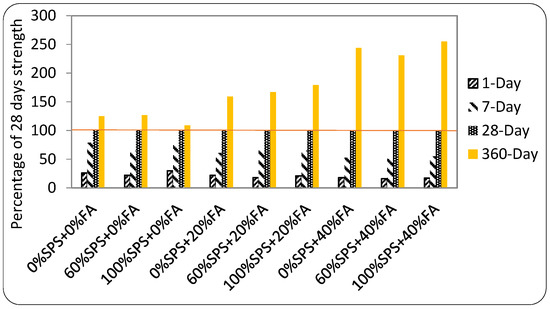 Figure 7 shows the percentage of 28 days’ strength gain of concrete with different contents of SPS and FA at different curing times. The 100% SPS concretes containing 0%, 20%, and 40% FA have shown 75%, 65%, and 55% of 28-day compressive strength, respectively, at seven days. Furthermore, strength gains of almost 8%, 44%, and 60% more than that of 28-day strength for 100% SPS mixes containing 0%, 20%, and 40% FA, respectively, have been obtained at 360 days’ curing. That means the rate of strength gain at an early age decreased and after a long curing period increased as the FA content in SPS concretes increased (Figure 6). The lower rate of strength development in concretes containing FA may be due to the effect of slow reactivity of FA at early ages. Similar results have been reported earlier [5,35,36]. This is due to the typically low fineness of FA compared to Portland cement and low pozzolanic activity of FA, which delays the strength gain of concrete [33]. The low pozzolanic activity is attributed to the high proportion of organic content as suggested by the high value of loss-of-ignition (23%). FA requires a long curing period to complete the hydration process because it decreases the heat of hydration in the concrete [32]. As we know the only compound which is responsible for early strength development in Portland cement is calcium silicate hydrate (C3S). Therefore, when Portland cement is replaced with any pozzolanic material (e.g., FA), the quantity of C3S is reduced, resulting in lower early strength development.