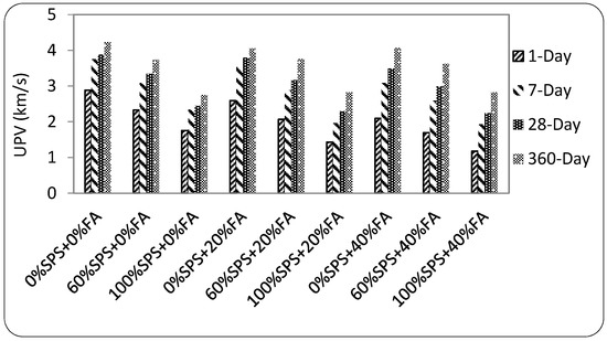 Figure 9 shows the UPV values of concrete containing different contents of SPS and FA at different curing times. The UPV values were in the range of 2.2–3.9 km/s at 28 days of age and 2.8–4.2 km/s at 360 days of age.