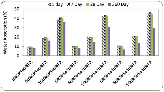 The 30 min and total WA of concrete containing different contents of SPS and FA at different curing times are illustrated in Table 5. The WA values at 30 min and total varied between 2.8% to 32.5% and 9.5% to 44.8%, respectively, at 28 days of curing.