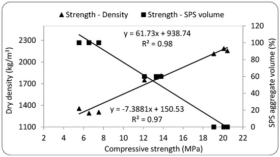 Figure 11 shows the relationship between compressive strength, density and volume of SPS + FA of concrete made with varying contents of SPS aggregate and FA at 360 days of age. The strength of concrete increased linearly with increasing in density (Equation (3)), or with the decrease in the SPS + FA contents (Equation (4)).