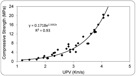 Equation (5) indicates a very strong positive relationship (R2 = 0.93), where X is the UPV (km/s) and Y is the compressive strength (MPa). The proposed equation is based on the 36 experimental points from the present study. A study [32] suggested the relationship between the compressive strength and UPV of concrete incorporating FA with UPV values between 2.7 to 4.1 km/s as ƒcu = 0.0142e0.0018V with R2 = 0.96. Another study [24] proposed the relationship between compressive strength and UPV values of concrete as ƒcu = 0.003e0.00217V with R2 = 0.97. However, the suggested equations underestimate the UPV values for a given strength.