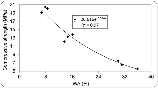In Equation (6), Y is the compressive strength (MPa) and x is the water absorption (%). The value (R2 = 0.97) represents a very strong negative correlation between the two compared parameters of compressive strength and WA for the concrete incorporating different amounts of SPS aggregate and FA.