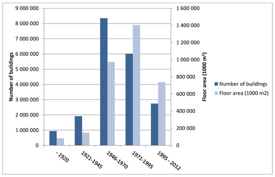According to latest statistical data, the total population of Russia is 146.5 million of which 74% live in urban areas [29]. The average living area per inhabitant is 23.9 m2 [29]. In Russia, there are nearly 20 million residential buildings with a total floor area of over 3300 million m2 [30]. 42% of these buildings were built during 1946–1970 and 30% during 1971–1995 (Figure 1). During the Soviet era, starting in the late 1950s, the housing problems of the Soviet Union were solved by building big blocks of flats which were poorly insulated and heated with district heating solutions which were implemented inefficiently. These energy-wasting buildings and facilities still comprise a majority of the buildings in Russian cities (Figure 2), although it was assumed that in 25 years they would be replaced by better dwellings and systems [31]. Estimates differ about the percentage of flats which should be repaired, ranging from 40 to 60% [32,33].
