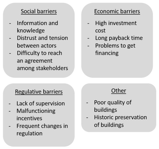 Economic barriers presented in the literature are very often related to too high initial investment costs and long payback time [20,21,22,46,48,49], problems with finding financial resources [24,25] sometimes because of unwillingness to borrow money [47] and sometimes because of banks’ low willingness to provide loans [19]. Baek and Park [46] present that the investment costs of housing renovation are too big especially to low-income families who often have great potential for CO2 reductions. Similarly, concern for lack of resources to refurbish homes and public spaces in suburbs has been expressed by Williams et al. [18]. Also, in Sweden, the low tariffs of district heating might cause a barrier as the reduction in cost for reducing energy consumption might remain rather low providing no incentive for energy saving [52].