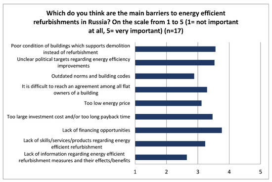 First, the respondents were asked to identify main barriers for energy efficient building refurbishment in Russia by assessing a set of barriers on the scale from 1 to 5. The results indicate that poor condition of buildings which supports demolition instead of refurbishment, unclear political targets regarding energy efficiency improvements and lack of financing opportunities are perceived as the most significant barriers (Figure 5). Barriers such as outdated norms and building codes and lack of information regarding energy efficient refurbishment measures and their effects/benefits were seen as less important barriers. However, the differences in the scores given to the barriers are rather small.