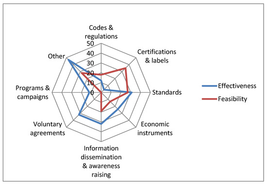 Standards, information dissemination & awareness raising and voluntary agreements were seen as by far the most effective policy instruments whereas codes & regulations, certifications & labels and programs & campaigns were not viewed as very useful. However, the same instruments were not seen as the most feasible ones. Only standards were identified as both effective and highly feasible. Surprisingly, the belief in taking up voluntary agreements, which was seen as one of the most effective instruments, was minimal. According to the interviews, the instruments referred to as “other” were mainly related to government initiatives and elimination of corruption.