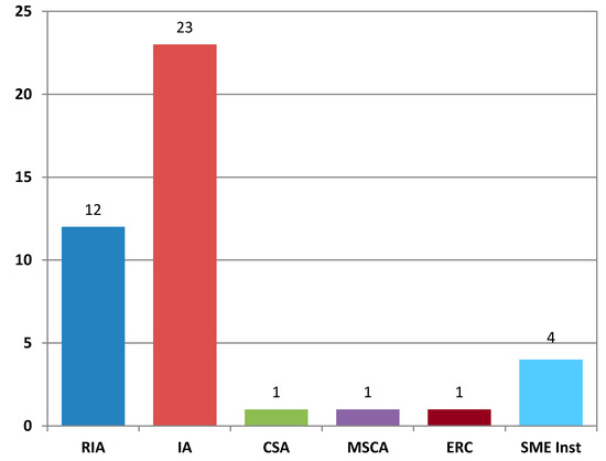 The final results of the research have found 42 relevant Horizon 2020 actions. These are funded across 28 topics, the majority of which are Research and Innovation Actions (RIA) and Innovation Actions (IA). Four projects have been funded under the SME Instrument Phase 2. The search also revealed one action for research and innovation staff exchange (RISE) under the Marie Skłodowska Curie action, one European Research Council (ERC) proof of concept grant, and one Coordination and Support Action (CSA) funded under the Energy Efficiency call of 2015. The total budget costs for these 42 actions add up to 367.9 million Euros, of which the EU grant contribution is 304.1 million Euros. These statistics are presented here below in Table 1 and Figure 1.