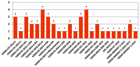 The 42 projects have been funded across 28 topics within 23 calls for proposals from the years 2014, 2015 and 2016 (see Figure 3). Of the 42 projects, 15 have been funded under the Energy Efficiency calls; seven are from the Smart Cities and Communities calls; seven from the Low Carbon Energy (LCE) calls; six from the Energy-efficient Buildings (EeB) calls; four from the SME Instrument (second phase); and one each are funded under the ICT call 2015 and from the European Research Council (ERC) and Marie Skłodowska-Curie actions (MSCA). A total of 20 projects, almost half the total, have been funded under the contractual Public-Private Partnerships (cPPP). The majority of these (14) come under the Energy Efficiency calls, with the remaining six being funded under EeB calls.