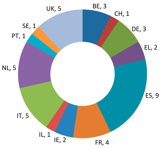 The coordinators of the 42 projects are situated in only 13 countries, which are shown in Figure 4. Nine projects are coordinated from Spain and five each from the UK, Netherlands and Italy. France is next with four projects and the remainder are shared between Germany and Belgium (three each), Greece and Ireland (two each), and one each in Switzerland, Portugal, Sweden and Israel. Therefore, none of the projects is coordinated from former Eastern Bloc or so-called “EU13” [33] countries. Of the two coordinators who are based in non-EU countries, the Swiss one is an SME Instrument project (POWERCLOUD: a cloud energy management solution for office equipment and smart devices) which is therefore acting alone rather than in a consortium, and the Israeli one is a European Research Council Proof of Concept grant (ERC PoC) for “Intelligent Control of Energy Storage for Smart Buildings and Grids”. All of the remaining projects that include relatively large consortia are therefore coordinated from Western European countries.