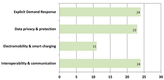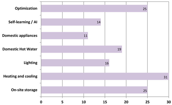 Figure 5, Figure 6 and Figure 7 illustrate the extent to which tasks related to the various aspects of a smart building, as previously explained in Section 4 above, are spread across the identified projects. It is possible to conclude that 29 projects are exploring the user interface for control of a smart building, 25 projects deal with on-site storage, and 11 projects are investigating the links between smart buildings and electro-mobility and smart charging. If one considers the three main features of the proposed Smart Readiness Indicator that was referred to earlier, the results show that 39 out of the 42 projects are investigating the building’s ability to interact with its users, 38 out of the 42 are investigating the building’s ability to manage itself, and 32 out of the 42 projects are investigating the building’s interaction with the wider energy environment. Thus, the three principal features are relatively equally represented across the range of projects. Nevertheless, within these totals it can also be said that the areas that are investigated by the fewest projects are electro-mobility and smart charging (12 projects), domestic appliances (11 projects) and self-learning/artificial intelligence (14 projects).