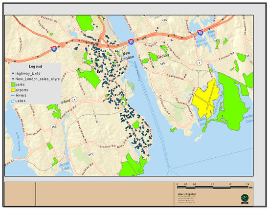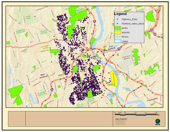We examine all ‘qualified’ sales of real estate in Hartford from 1 October 2005 through 30 September 2009. This period (October to September) corresponds with the tax years 2006 through 2010 and is the term used by the state to calculate the assessment ratios for municipalities. The locations of these properties, along with the locations of highway exits, the nearest airport, and parks, are shown in Figure 7. Since no land or site value is calculated by the city for condominiums, condominiums are not examined in our study. Like New London and New Haven, the complexity and variety of property in Hartford should result in a coefficient of dispersion of fifteen percent or less in 2006 [10].