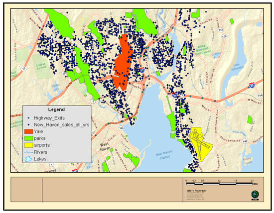 We examine all ‘qualified’ sales of real estate in New Haven from 1 October 2005 through 30 September 2010. This period (October through September) corresponds with the tax years 2006 through 2010 and is the term used by the state to calculate the assessment ratios for municipalities. The locations of the sales for the tax years 2007 to 2010, as well as other landmarks such as parks, highway exits, the airport, and Yale University, can be seen in Figure 4. Since no land or site value is calculated by the City for condominiums, condominiums are not examined in this study. Similar to New London, the complexity and variety of property in New Haven should result in a coefficient of dispersion of fifteen percent or less in 2006 [10].