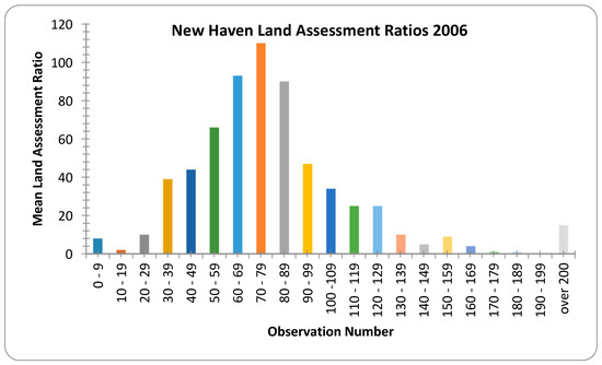 Land assessment ratios in New Haven for the tax year 2006. The observation number (horizontal axis) is a range, and the Mean Land Assessment Ratio (vertical axis) is the mean overall ratio in the corresponding range. For instance, 0–9 indicates observations 0 to 9; …; over 200 indicates observations 200 and over.