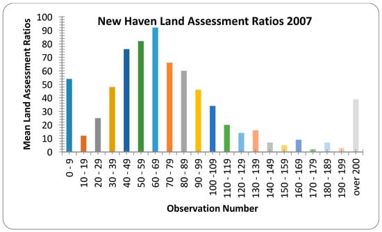 Land assessment ratios in New Haven for the tax year 2007. The observation number (horizontal axis) is a range, and the Mean Land Assessment Ratio (vertical axis) is the mean overall ratio in the corresponding range. For instance, 0–9 indicates observations 0 to 9; …; over 200 indicates observations 200 and over.