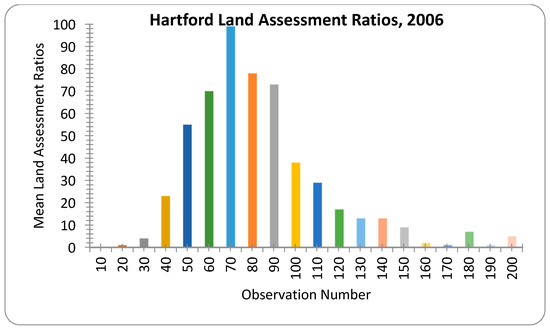 Hartford Land assessment ratios for the tax year 2006. The observation number (horizontal axis) is a range, and the Mean Land assessment ratio (vertical axis) is the mean overall ratio in the corresponding range. For instance, 10 indicates observations 0 to 10; 20 indicates observations 11 to 20; …; 200 indicates observations 200 and over.