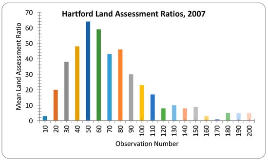 Hartford Land assessment ratios for the tax year 2007. The observation number (horizontal axis) is a range, and the Mean Land Assessment Ratio (vertical axis) is the mean overall ratio in the corresponding range. For instance, 10 indicates observations 0 to 10; 20 indicates observations 11 to 20; …; 200 indicates observations 200 and over.