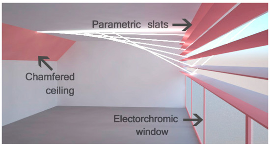 The proposed parametric system is using three main tools based on a previous study [8]. The first tool is the “mirrored louvers” with 75% reflectivity, which are used to redirect the sun light inside the deep room into specific targets over the ceiling, then the ceiling works as a source of light. The louvers respond parametrically to the sun movement during the daytime with a specific rotation angle for each single slat [20], which is the so-called parametric control. The louvers are located at the upper part of the window from the outside, with 2.2 m height from the floor. The second tool is the electrochromic window [22], located at the lower part of the window that is also controlled parametrically, based on the intensity of solar radiation [8] and used to provide the room with the needed diffuse light, valued between 300 and 500 lux. The diffuse light coming from the electrochromic window was amended by controlling the translucency value by using “Radiation Trans Material” as a component in Honeybee [23]. The last tool is the design of the ceiling [24] at the end of the room, which has a chamfered shape with 45° tilt angle. This chamfered ceiling was designed to redirect the reflected light from the louvers, in order to enhance the performance of daylight at the deep area of the room [8], see Figure 1.