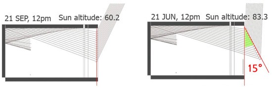 It can be observed in Figure 8 and Figure 9 that the conventional system does not exceeding 25% coverage in June and September, however, it reaches 38% coverage on December at its peak due to the low inclination of the sun altitude, as shown in Figure 10, where it can reach deep coverage inside the room. In addition to the previous point, we can observe that the illumination coverage is relatively constant during the daytime in June and September, while there is a notable variation during the daytime in December.