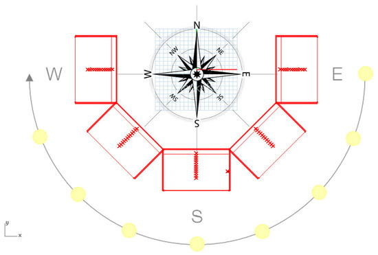 In Section 3.3, the office room will be examined in different five orientations; on the West, Southwest, South, Southeast, and East by using unified criteria, as shown in Figure 3. The daylight performance test will be occurred on each orientation during the working hours from 9 a.m. to 5 p.m., on 21 of June, September and December, respectively. The test will measure the average coverage of daylight over the whole room area each hour in percentage, by using a 1 m2 grid of test points as a sensor at the desk level height 0.75 m, The experiment was set to count the test points which can reach a range between 300 and 500 lux in order to meet the human visual comfort [26]. Regarding to Chartered Institution of Building Services Engineers (CIBSE), a professional institution for lighting guide in the UK, which investigated the standards of daylighting levels, recommends a range of 300~500 lux for offices spaces [27]. A previous research [28] claims that due to occupants’ survey; the lighting level between 100 and 2000 lux can meet their comfort. However, our study will focus on using the lighting level standard of 300~500 lux, putting in consideration the potential effect of the contrast level and glare. Meanwhile, if we consider 100–2000 lux as a useful range for occupants, our study should be in the safe side.
