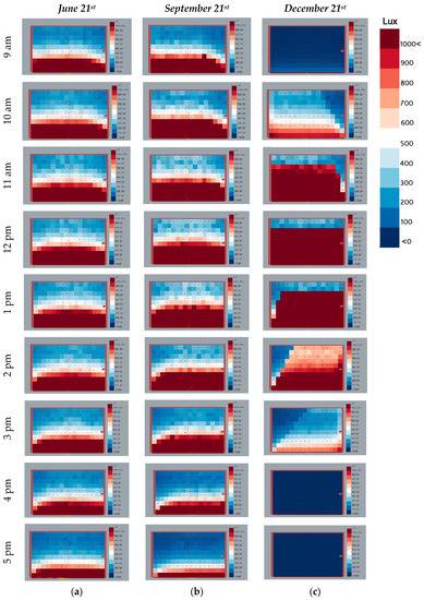 Daylight coverage analysis during the working hours using conventional system for a south oriented office room on 21 June (a); September (b); and December (c).