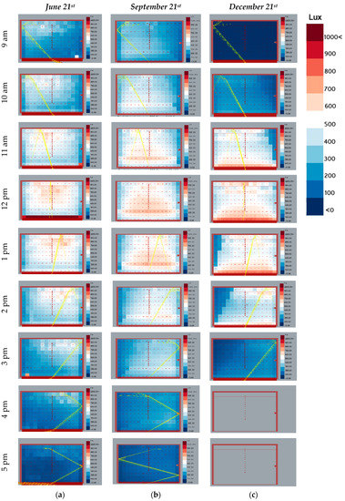 Daylight coverage analysis during the working hours using parametric system for a south oriented office room on 21 June (a); September (b); and December (c).