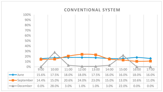 The next graphs are showing the coverage percentage during the working hours in June, September and December, respectively, by using the conventional daylighting system.