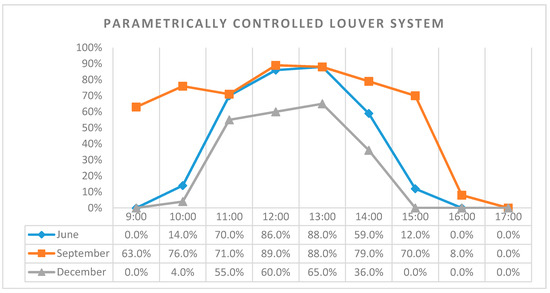 Table 2 is showing the potential daylight coverage achieved by using the parametric louver system during the working hours in the selected office room. The test points inside the office room recorded the daily average daylighting coverage percentage during the working hours throughout the year, putting in consideration the two days’ vacation during the week, which were not accounted. The monthly averaged from daily daylighting coverage percentages are revealed at the end of the table and in Table 2.