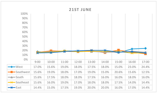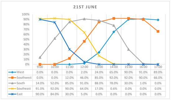 Coverage percentage during the working hours for the office room through the five orientations on 21 June, using the parametric system.