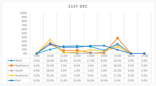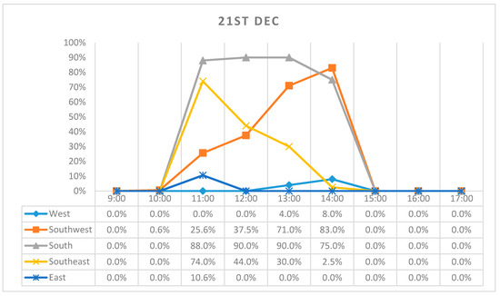 When applying the parametric system, we can observe that daylighting coverage achieves more than 90% in all of the orientations with some fluctuations due to the difference in directions, see Figure 12, Figure 13 and Figure 14. It is worth to be mentioned that the South and the Southwest orientations are giving the best daylight coverage when comparing to other orientations in all of the seasons. It can be observed in Figure 14 that the South orientation is giving the best performance from 11 a.m. to 2 p.m. only. The reason of that is that the daytime is relatively short in December at this specific territory, where the sun altitudes at the morning and the evening are low and probably have the risk of blocking by trees or surrounding buildings.