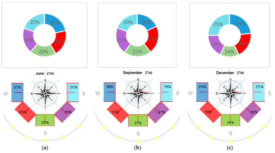 Daily average coverage percentage in June (a); September (b); and December (c) by using the conventional system on the five orientations.