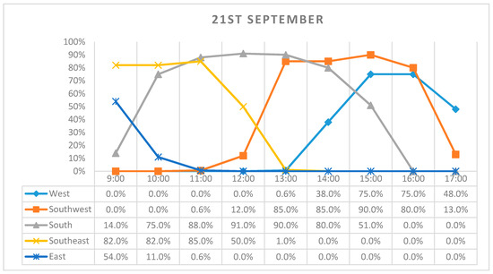 Coverage percentage during the working hours for the office room through the five orientations on 21 September, using the parametric system.