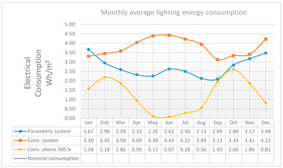 For the parametric system, we can observe in Figure 16 relatively higher lighting energy consumption in November, December and January comparing to the other months, due to the poor weather conditions in winter in addition to the lower solar altitude, which causes weak solar radiation and the daytime becomes very short especially in such a territory like the UK. On the other hand, regarding the conventional system, we can observe an interference with the parametric system in January due to the availability of diffuse light (horizontal light) in this month which relatively reduces the amount of electrical energy consumption. Putting in consideration that our proposed system focused on providing as much as possible of constant and distributed daylight which mainly depends on direct solar radiation, which is dramatically not available in this specific month in this territory. Moreover, we can see the conventional system in a yellow line is consuming lower energy comparing to the parametric system, this system is not achieving the other criterion of the accepted range 300~500 lux, which means that such system is not succeeded as mentioned previously.