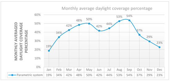Monthly averaged daylight coverage percentage in the office room for the daylight illuminance range of 300~500 lux by using the parametrically controlled system.