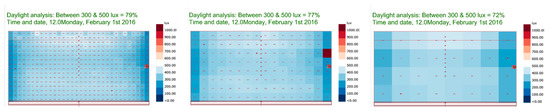 It is remarkable to bear in mind that the calculated daylight coverage was considered only for the daylight illuminance range of 300~500 lux, however, for some dates in some cases the daylight illuminance may exceed this level or even less than 300 lux, which consequently not accounted in the calculation, therefore resulting in lower coverage values, see Figure 17. The simulation results of RADIANCE/DAYSIM may be largely affected by the chosen number of bounces and test points to control the radiation quality, which can be adjusted from the “rad Parameters” component in the simulation settings. Putting in consideration that this may take longer time for running the simulation in addition to the used computer performance. Accordingly, this influences on the analysis quality and the results accuracy. While this article was investigating the annual daylight performance based on hourly analysis, therefore, the simulation settings were set to the standard level in order to save time. Therefore, it worth to mention that the proposed system can achieve better performance regardless the time consuming and computer performance, in order to achieve the required illuminance level 500 lux. Figure 18 is revealing the difference between the analysis accuracy levels for the office room on 1 February at 12 p.m., where our study was using the middle level.