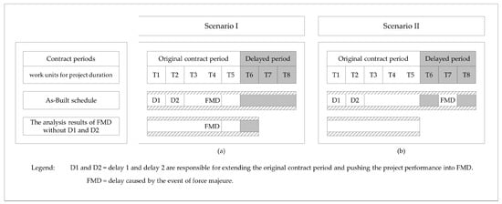 Although there is no place for recovering any damages when the force majeure delay meets the above criteria, the occurrence time for the force majeure event during the contractual periods is however an important criterion that should not be neglected when determining the entitlements that ought to be granted to the affected parties. To clearly illustrate this criterion, Figure 1 shows two different scenarios for force majeure delay on the schedule. In Scenario I, force majeure delay (FMD) occurred during the original contract period. For Scenario II, FMD occurred in the delayed period after the original contract period. In both scenarios, FMDs have occurred on the schedule and caused a delay to the project performance due to different reasons, as follows.