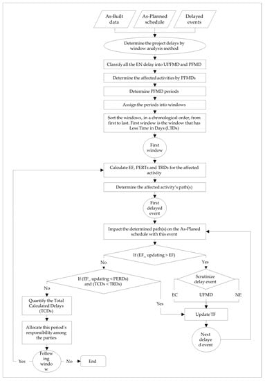 The proposed improved methodology addresses the first step using the window analysis method, which offers the most accurate results in determining critical project delays. The procedures for running window analysis have been extensively described in the literature (see, for example, [,,,,,]), and therefore will not be discussed any further in this paper. For the last two steps of the methodology requirements, it is significant to develop an appropriate and dedicated method for resolving the issue of PFMD responsibility.