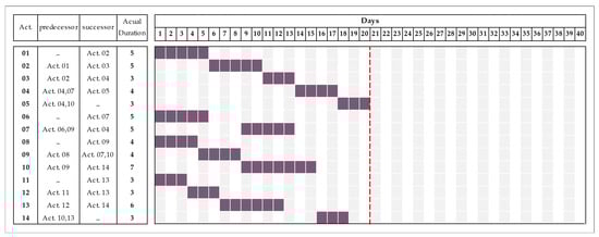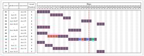 In order to evaluate the proposed method more thoroughly, a test case was designed and simulated with various construction delay scenarios. It involves a construction of a project that has 14 activities and is affected by the most common scheduling issues. The idea behind designing this case-study is to show obviously a particular situation where the effect of the parties’ delays extends the project performance into PFMDs, as shown in DTC’s claim []. Though the proposed methodology has the capability to be used in delay analysis processes for real-life projects, it however involves a large amount of processes and information that exceeds the limited space for this paper, as well as a calculation procedure that would be difficult to handle manually. Therefore, this case is found to be suitable to assess the approach process.