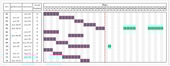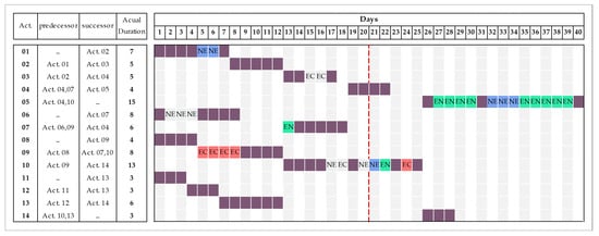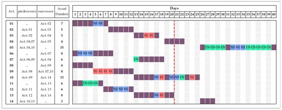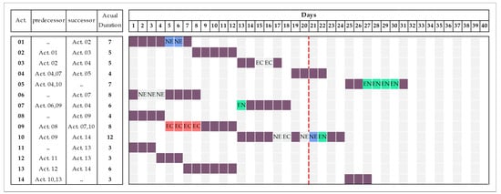 The project’s as-planned schedule along with the activity, duration, and independent relationships are shown in Figure 3. The as-planned schedule indicates a total project duration of 20 days. The project started as scheduled but progress was affected by three main types of delay events: (EC) events for which the contractor is entitled to both time extensions and recovery of extra cost consequential upon the delay; (NE) events for which the contractor assumes the risks of costs and the time consequences involved; and finally, (EN) events which no party has control over, (e.g., acts of God). In this test case, all EN events identified are force majeure delays. The as-built schedule maintains the same activities and relationships but contains the delays as shown in Figure 4, forcing the total project duration to 40 days. The following section will explain the analysis conducted on the delay by using the method’s procedure that proposed in this paper.