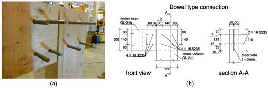 Moreover, the semi-rigid connection stiffness required for modelling and predicting the in-service dynamic behaviour of dowel-type connections is different from the stiffness required for static loading []. Furthermore, is empirically determined, independent of the geometry of the connection, relying only on the diameter of the connector and the timber density. The nonlinearity resulting from ductile connections makes their modelling difficult. Many numerical models have been developed to simulate such a behaviour [,,] based on the mechanical parameters that play significant roles in the connection. Validation of the model through experimental campaign can be done in order to compare test data to model prediction [].